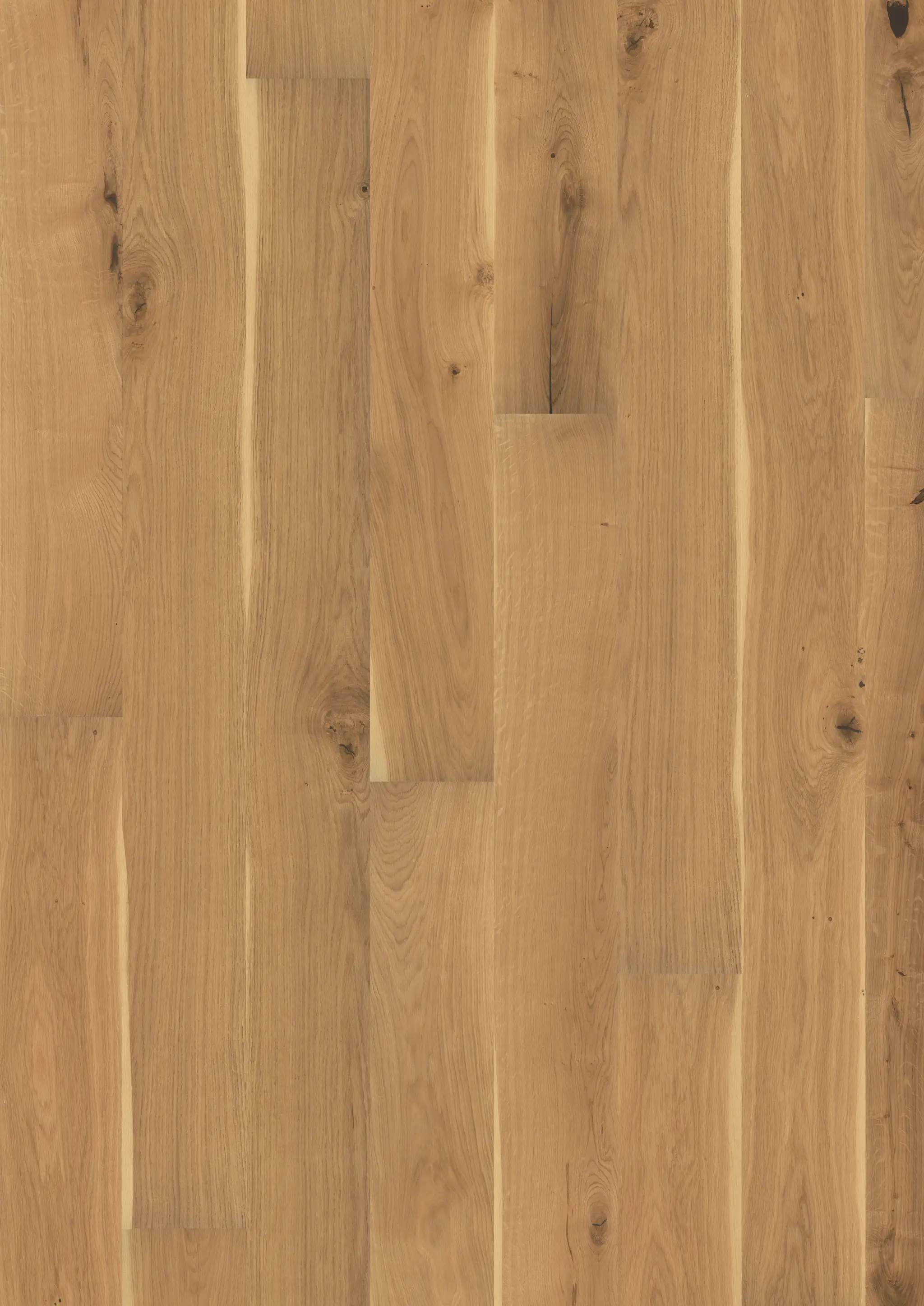 Bei diesem Produkt steht die Eiche in ihrer reinsten Form im Mittelpunkt und zeigt ihre warme, natürliche Farbe. Jede Diele wird sorgfältig gebürstet und geölt, um die Holzstruktur zu betonen. Das sichtbare Splintholz setzt einen eleganten Farbkontrast und lässt die ursprüngliche Schönheit des Materials voll zur Geltung kommen.