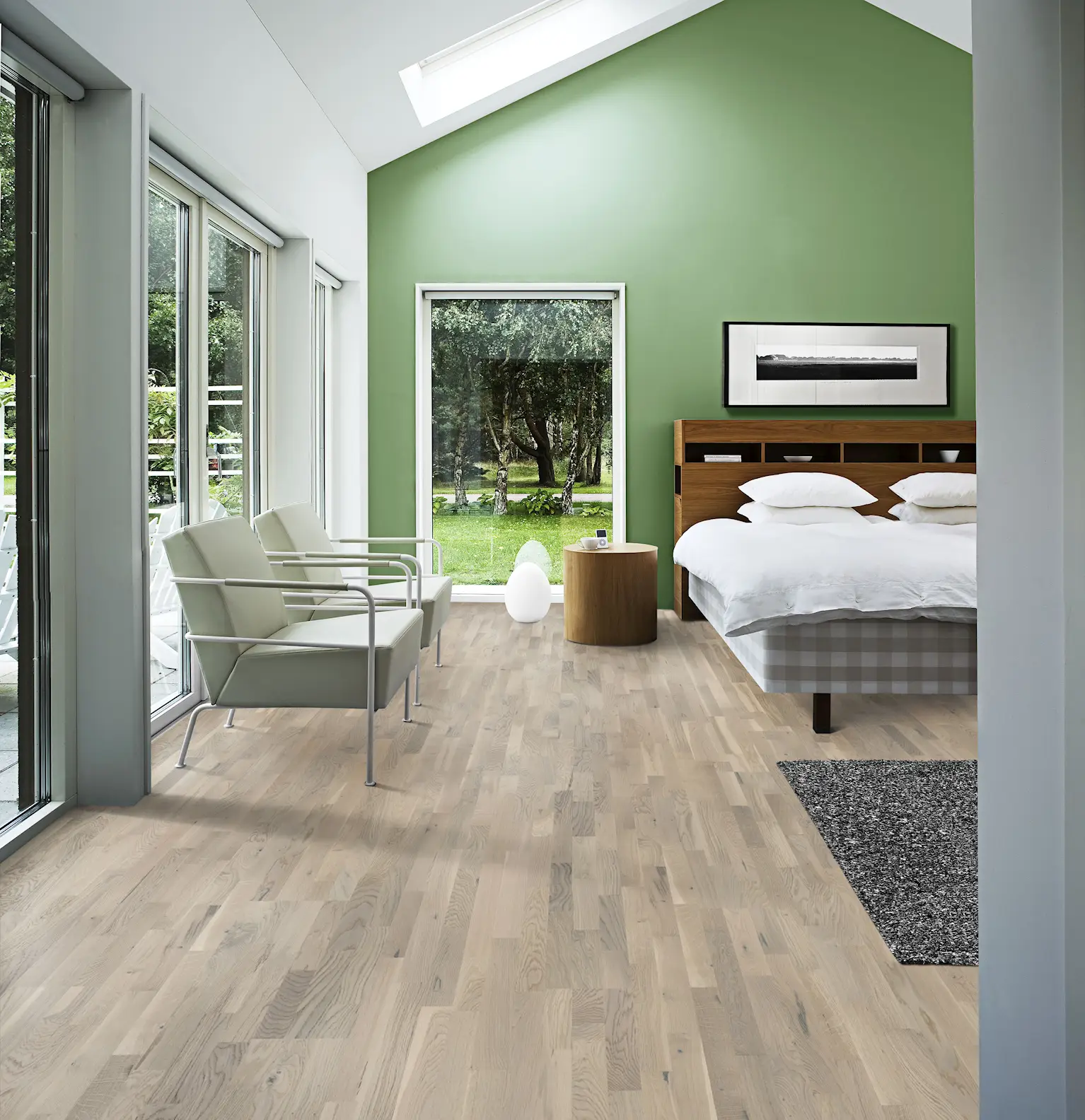 Das sanfte Cremeweiß dieses 13 mm Schiffsboden verschmilzt mit den warmen Tönen der Eiche. Lebendiges Eichenholz mit Ästen und Splint sorgen für den besonders natürlichen Charakter.