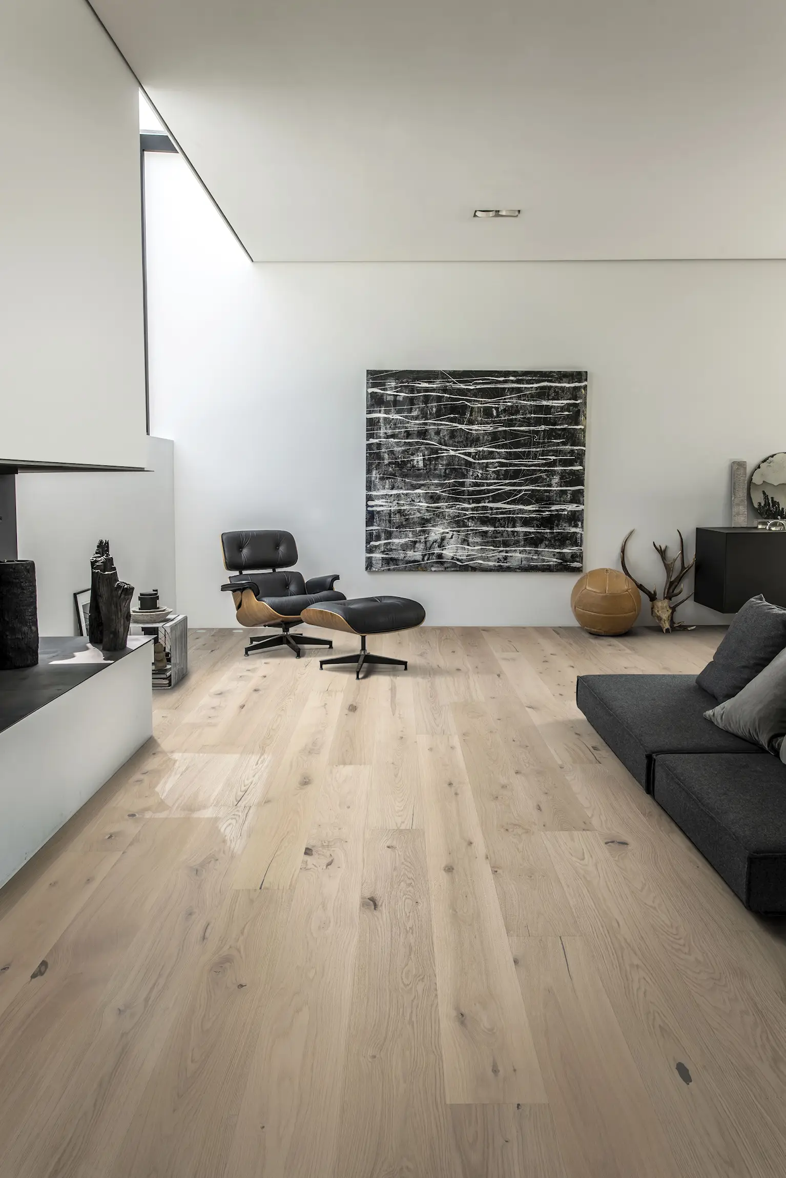 Diese rustikale Eiche-Landhausdiele der Lux Collection ist weiß gebeizt und rundum gefast. Jede Diele wird sorgfältig bis zur Perfektion gebürstet, um den natürlichen Charakter des Holzes hervorzuheben. Durch das ultra-matte Finish fühlen sich die Dielen an, als würden sie aus unbehandeltem, frisch gesägtem Holz bestehen. Die Oberflächenbehandlung absorbiert das Licht, während sie den Boden vor täglichen Beanspruchungen schützt.
