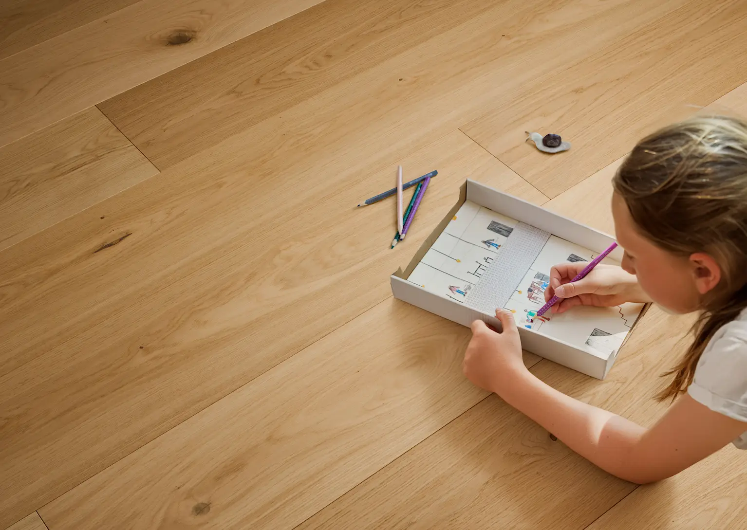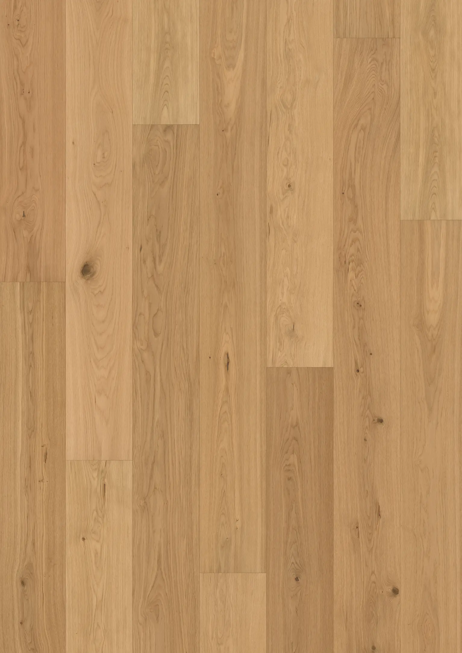 Der warme, helle Farbton und das größere Dielenformat verleihen dem Raum Offenheit und Eleganz.