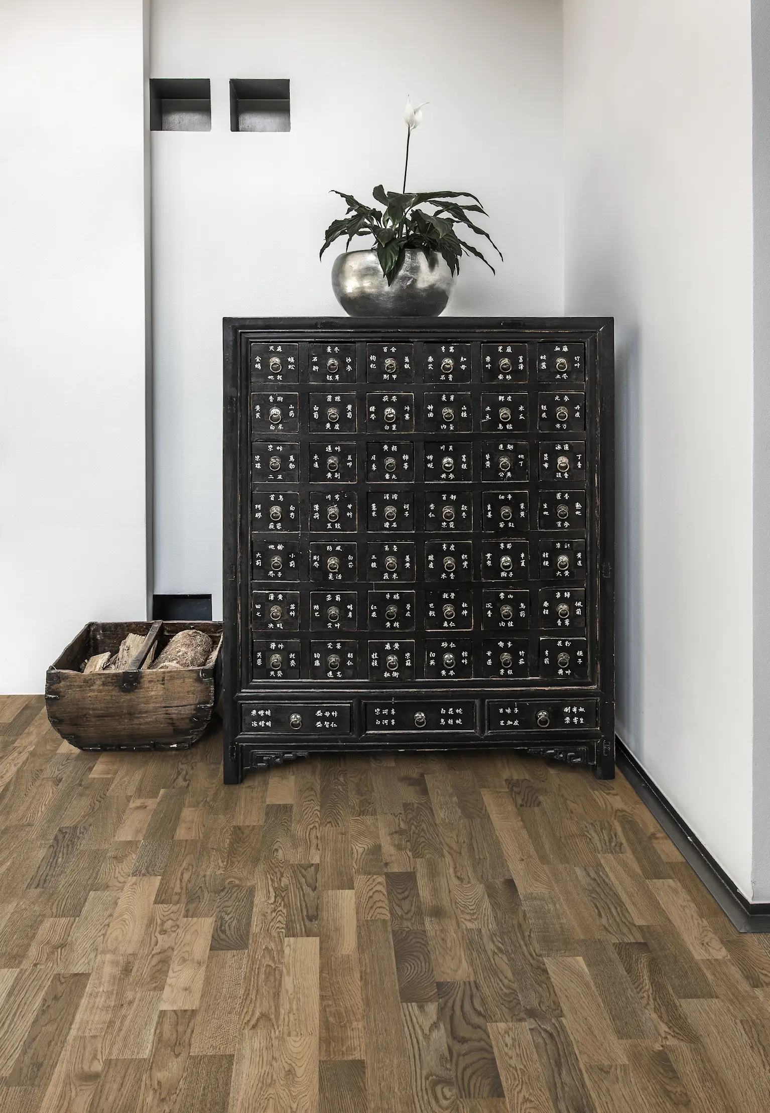 Dieser 3-Stab Eichenboden aus der Lumen Collection in gesättigten Erdtönen wird zusätzlich geräuchert, was die Struktur des Holzes hervorhebt.