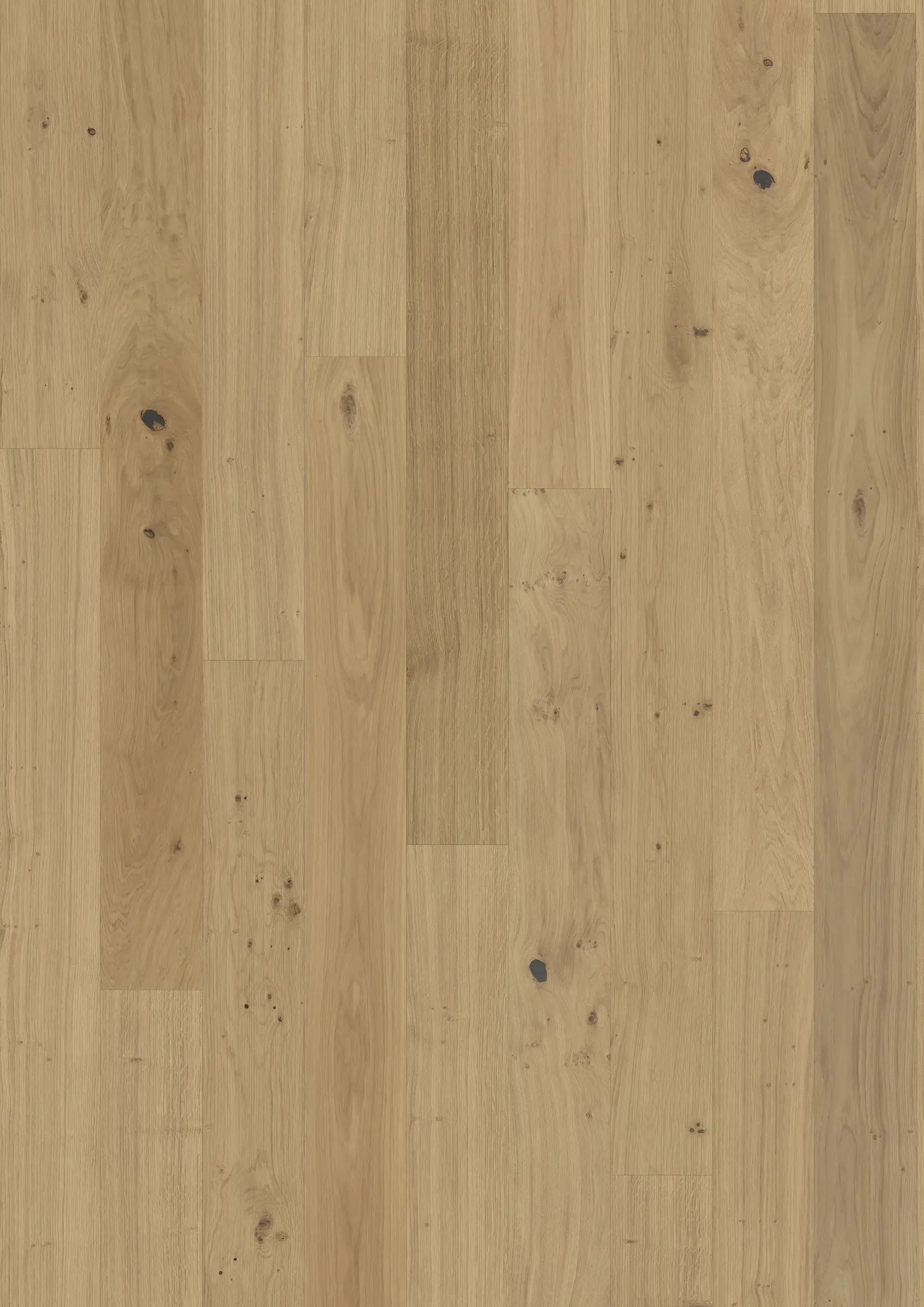 Gebürstete Eiche Landhausdiele in Rohholzoptik mit gefasten Kanten und natürlichem Holzcharakter. Äste und Risse unterstreichen die gewollt lebendige Optik.