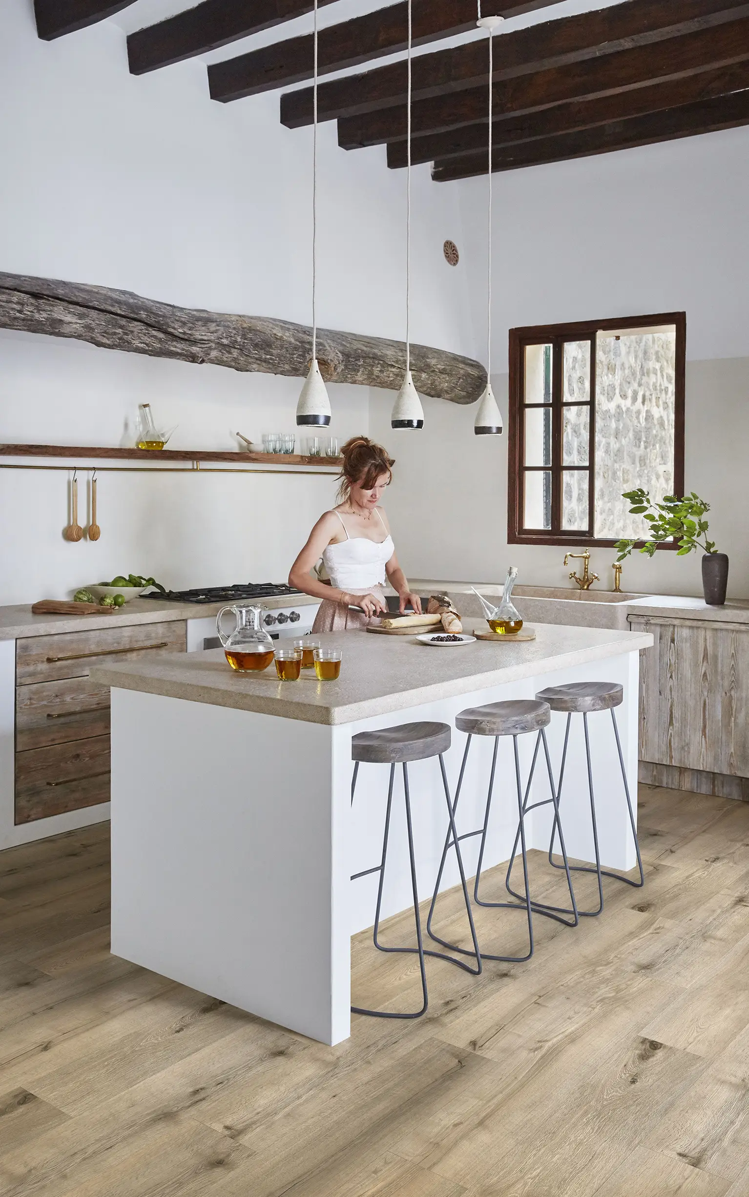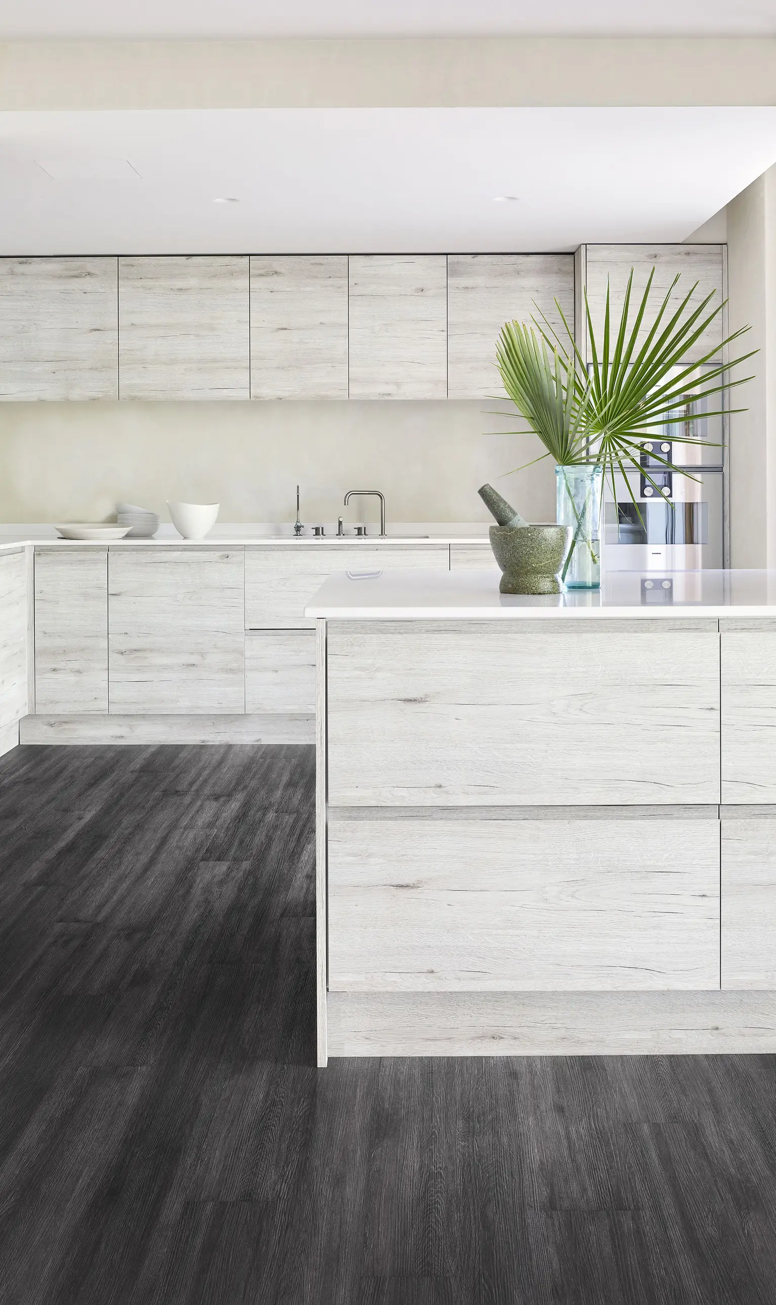 Verlegen Sie die Dielen entlang der Raumlänge, um die natürlichen Proportionen des Raumes zu betonen. Wenn Sie einen Klick-Vinylboden schwimmend verlegen, achten Sie darauf, dass umlaufend eine Dehnungsfuge von mindestens 10 mm zu den Wänden eingehalten wird. Zudem sollte die Bewegungsfähigkeit eines schwimmend verlegten Bodens nicht durch schwere Möbel wie Küchenzeilen oder Schrankwände behindert werden.