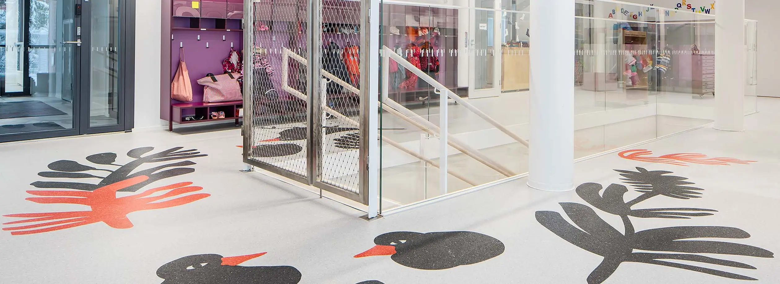 Upofloors golv Enomer® Zero Tile and Quartz Mosaic valdes vid reparation och justeringar av Kivimies förskola och skola i Esbo, Finland. De viktigaste golvegenskaperna för förskola och skola är hög slitstyrka och låga utsläpp (utsläppsklassificering M1 för byggmaterial), vilket Upofloors golv kan erbjuda.