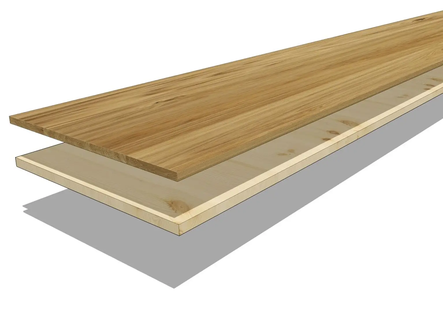 Våra 2-skiktsgolv består av ett högkvalitativt ytskikt och en robust baksida av furu/gran. De är 11 mm tjocka och kan slipas om flera gånger – perfekt för en lång livslängd med stil och komfort.