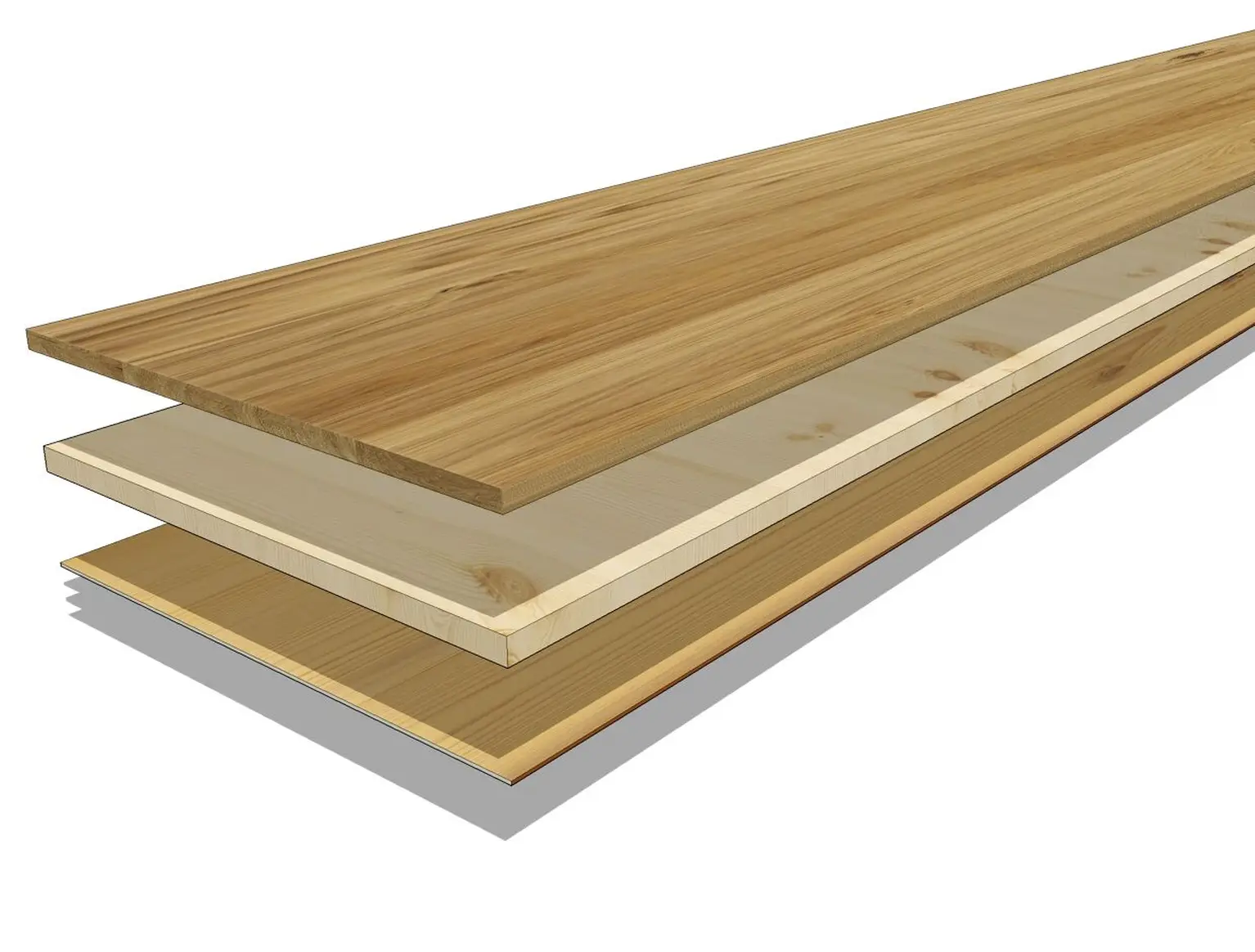Våra parkettgolv är tillverkade för bestående skönhet och vardagsbeständighet. De består av ett ytskikt, en kärna av furu/gran och en stabiliserande baksida, vilket ger exceptionell hållbarhet med en total tjocklek på 13–15 mm.