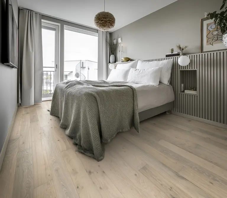Kährs erbjuder ett brett sortiment av trägolv och vinylgolv för sovrum i lugnande, naturliga nyanser som passar perfekt till denna estetik. Oavsett om du föredrar klassiskt massivt trä, elegant fiskbensmönster eller modernt vinylgolv i ljusgrå eller djupa nyanser hittar du ett golv som passar både din stil och din vila.