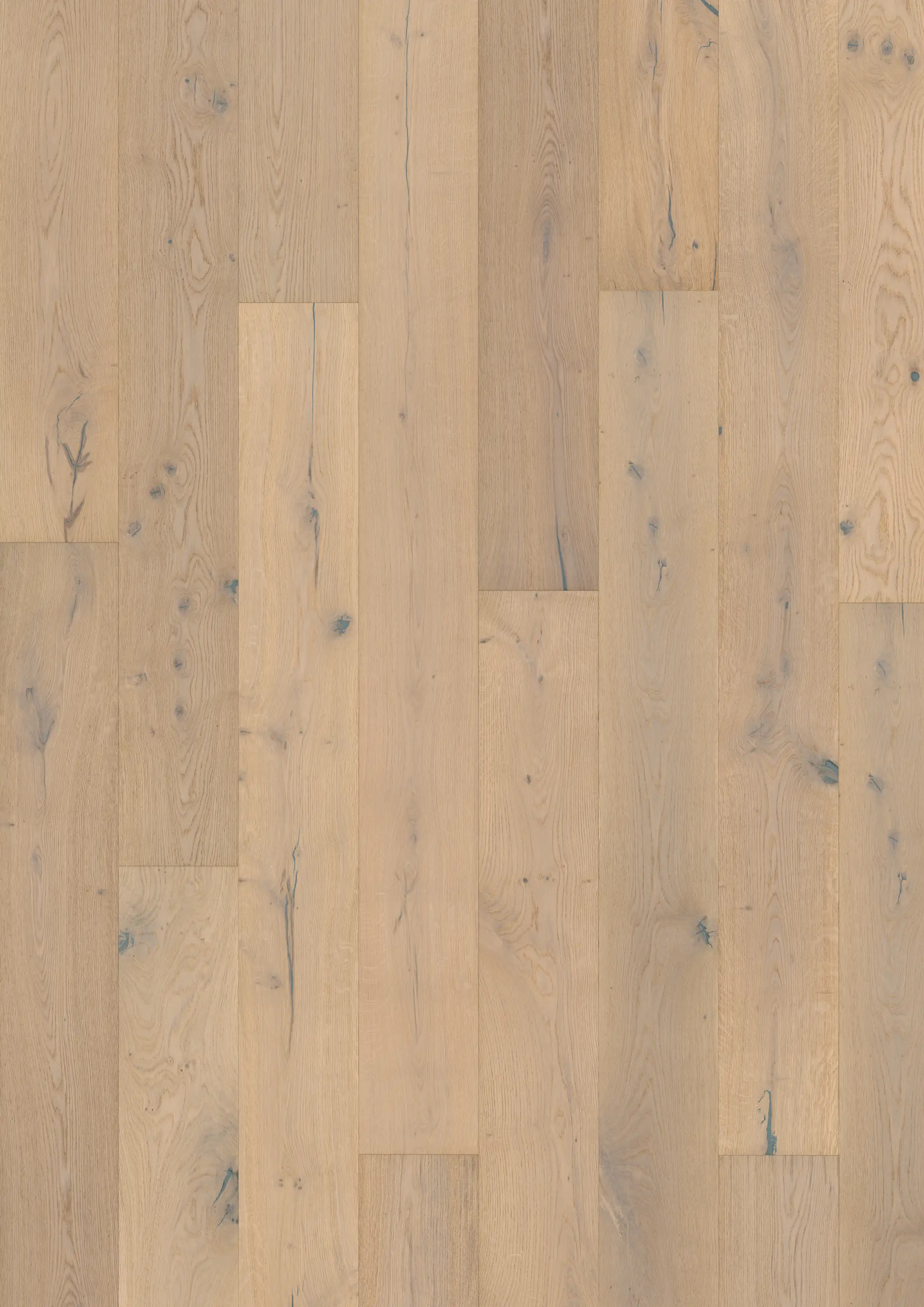 Misty white oak planks with a blanched wash offer a light, warm foundation. Brushed to soften contrasts while highlighting knots, cracks, and the natural grain for a serene, textured look.