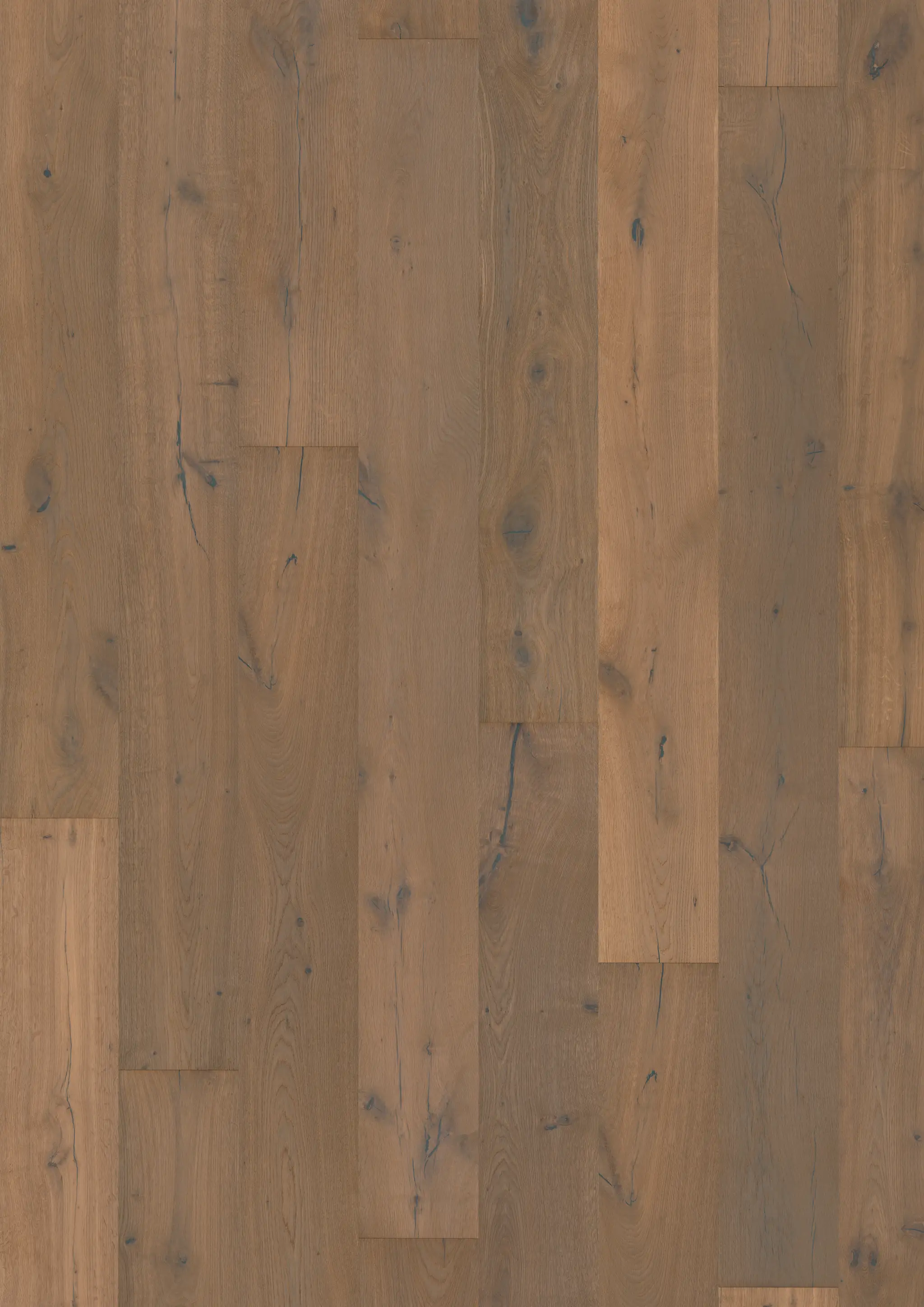 The darker grey stain of Oak Tramontane gives this floor a refined yet rustic expression perfect for any interior, where one wants to create a warm yet sophisticated impression. The careful brushing of each plank brings out the natural wood grain while the contrast of the darker knots and cracks are softened by the overall warm, dark stain. This without diminishing the effect of these natural design elements featured in each wide plank.