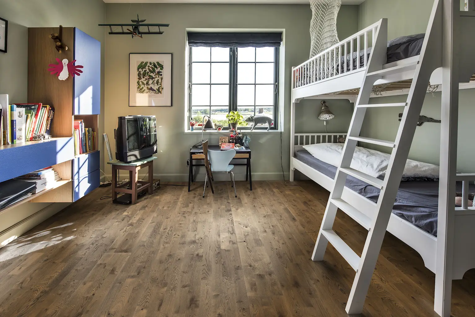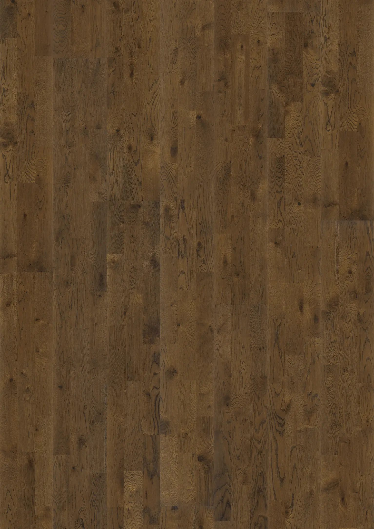 3-strip oak floor with warm, burnished tones and natural knots and color variation for a rich, textured look. Brushed to enhance the grain, with a matt lacquer finish for soft sheen and daily protection.