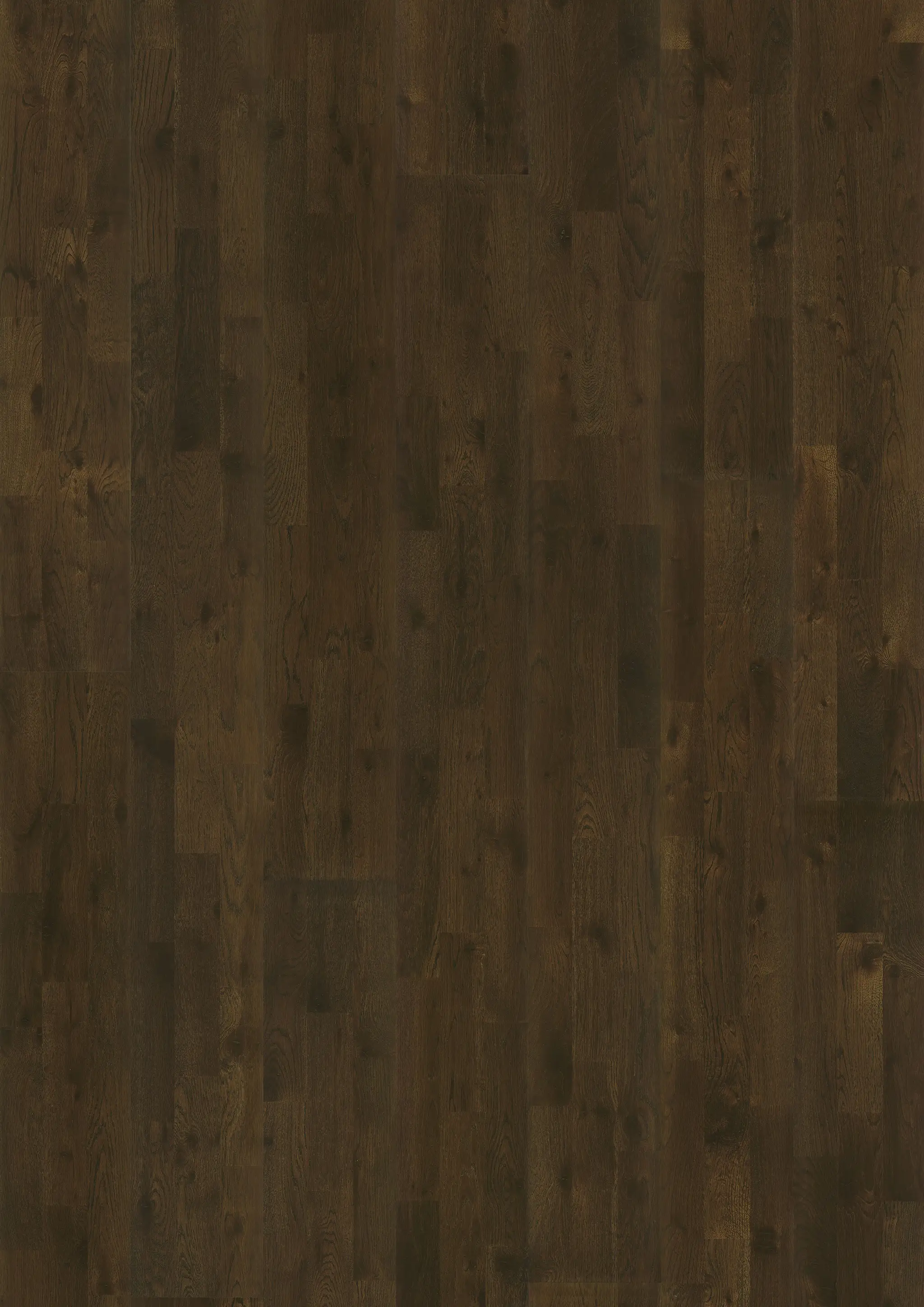 3-strip oak floor with chocolate brown hues and warm undertones for a rich, robust look. Brushed to enhance the grain and texture, with a matt lacquer finish for glare-free protection and natural elegance.