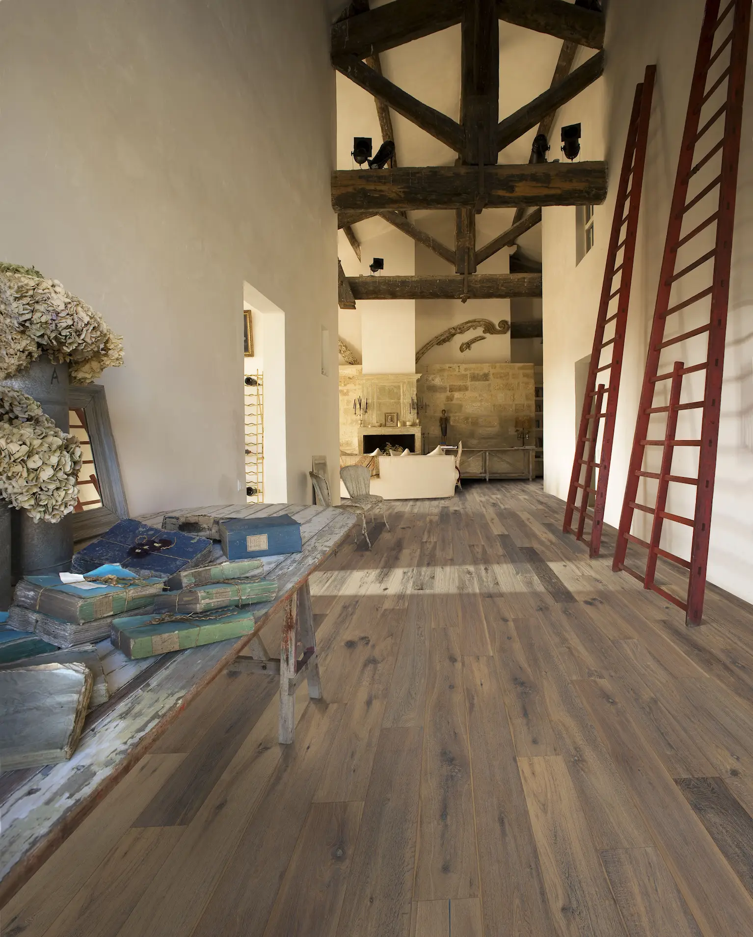 A rustic, handscraped product. Grey stain and nature oil.