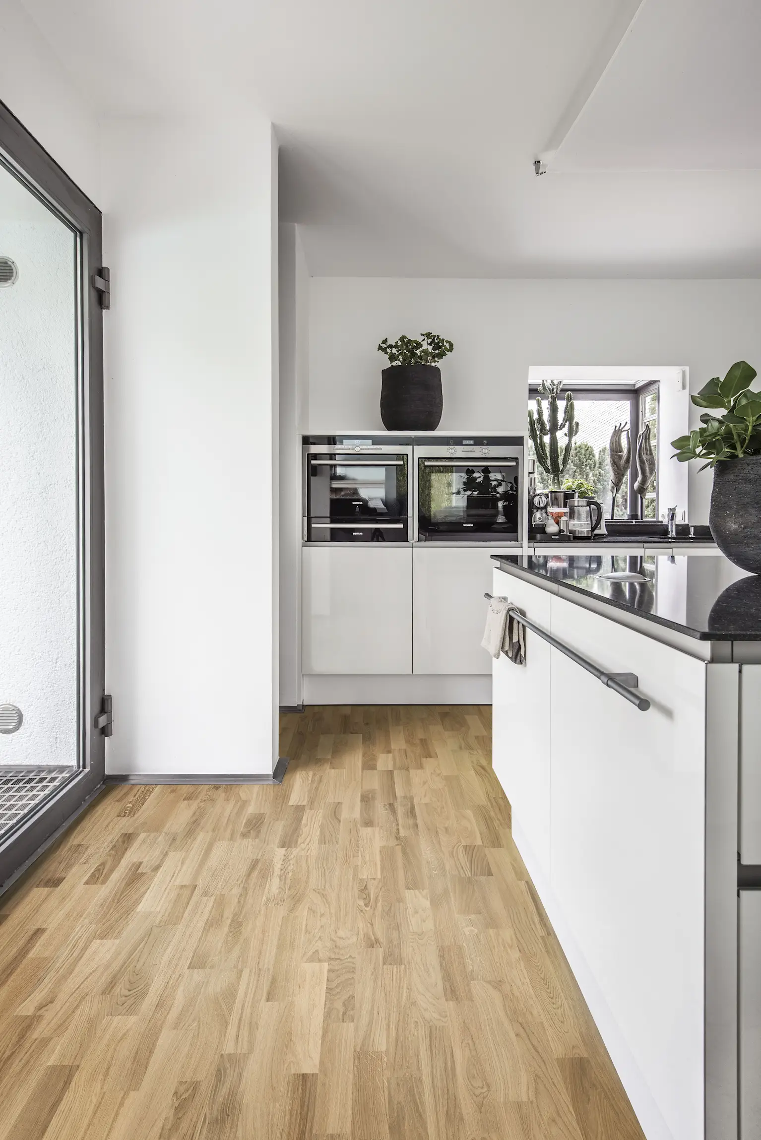 Natural oak 3-strip floor with warm, washed undertones. Features lighter, calmer expression than conventional oak. Brushed grain with ultra-matt lacquer finish for glare-free protection.