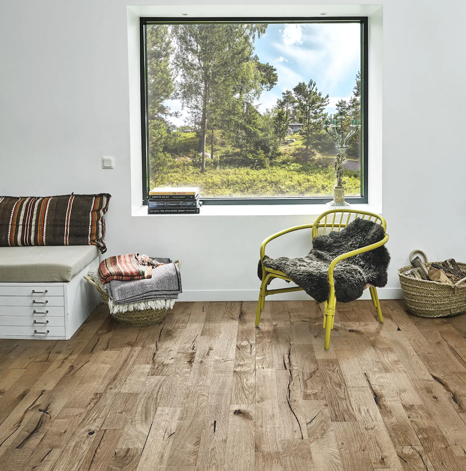 Honey-hued oak 2-strip floor with charcoal knots and cracks. Brushed grain enhances natural texture. Four-sided bevels and meticulous hand-scraping create an aged, rustic appearance.