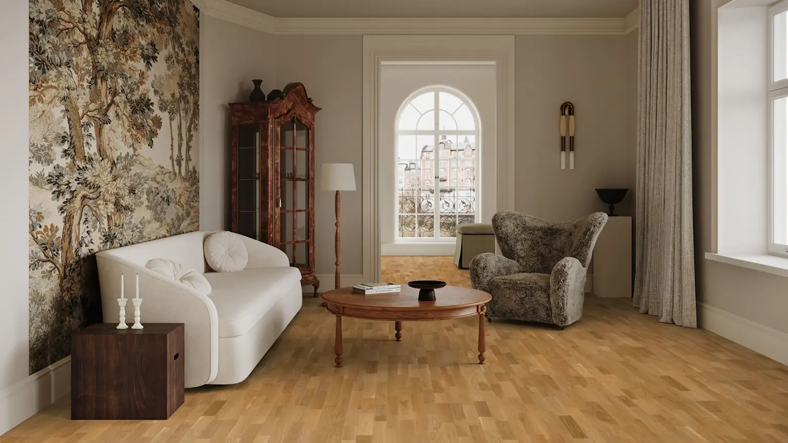 3-strip oak floor with warm brown and caraway seed hues, featuring minimal knots for a calm, even, and refined look.