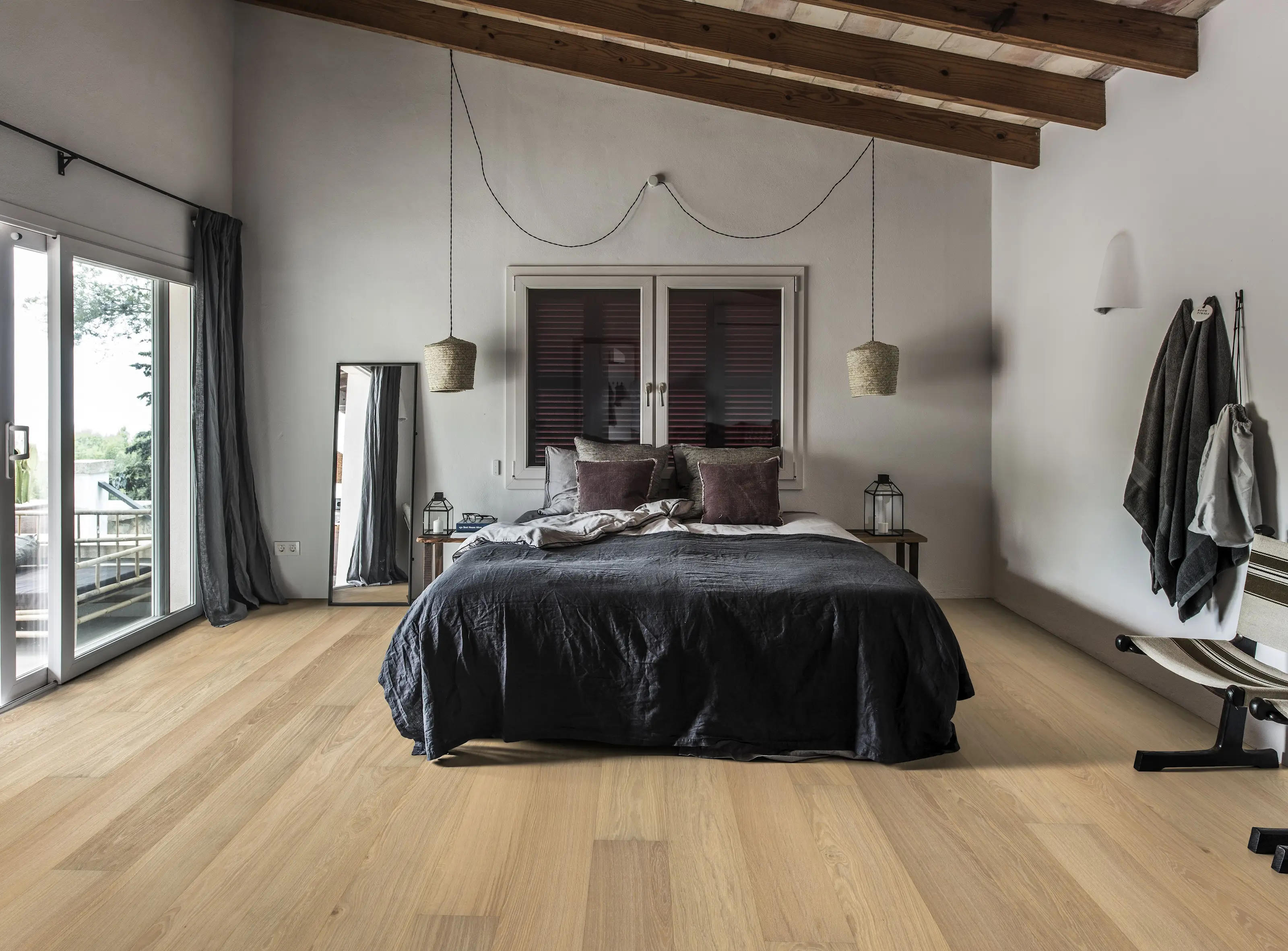 Blonde oak planks with even color variation and a brushed finish highlight the natural grain and texture. Four-sided bevelling adds depth and a timeless full plank appearance.