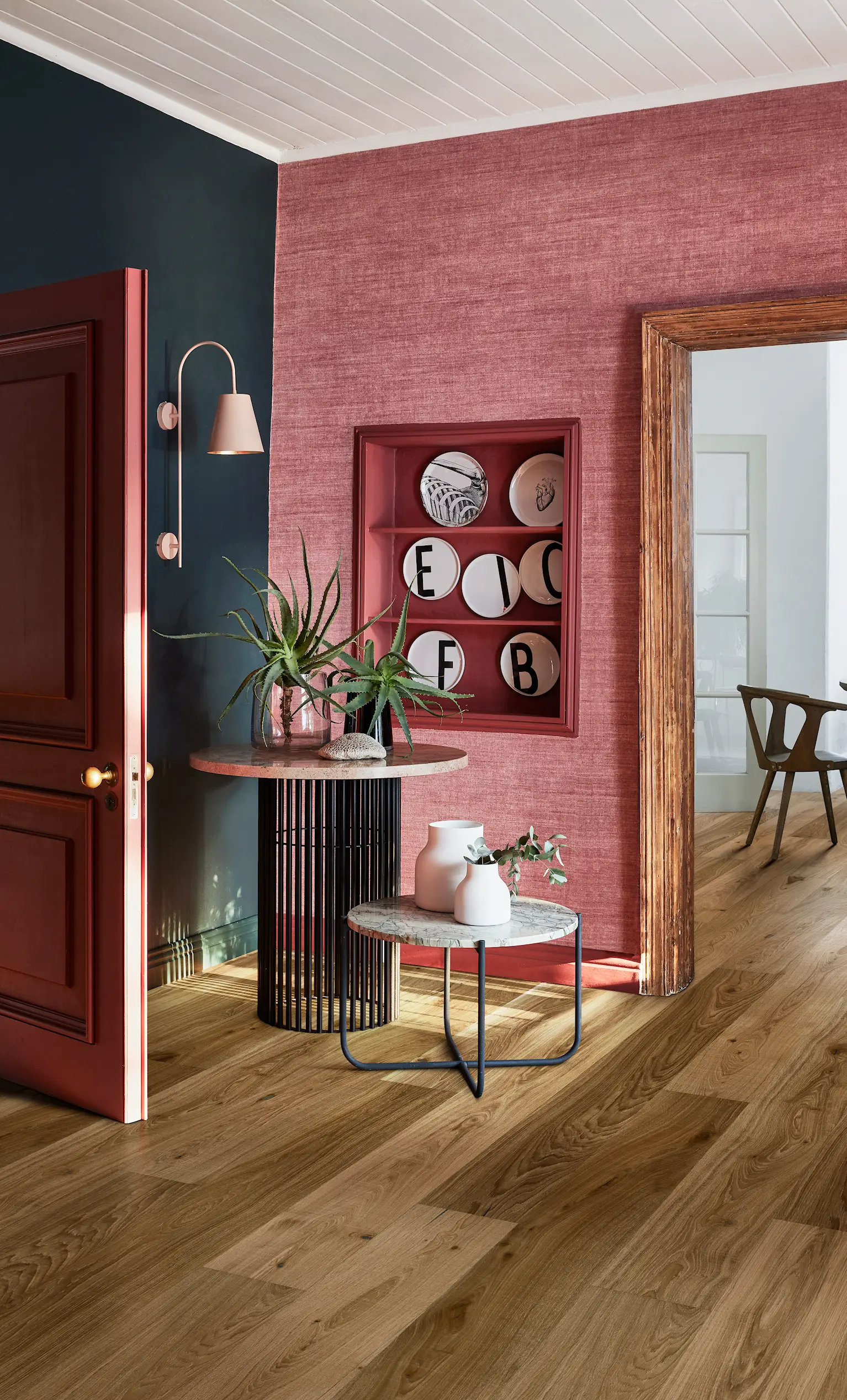 Oak Piazza CD Crème White is a premium 2-layer parquet flooring crafted from European oak, featuring knots and moderate colour variations. The plank format is highlighted by four-sided micro-bevelling, while the brushed and white oiled finish enhances the wood’s natural grain and texture. Kährs Piazza and Large Herringbone products can be installed together making it possible to use Piazza as frame board for herringbone pattern.
