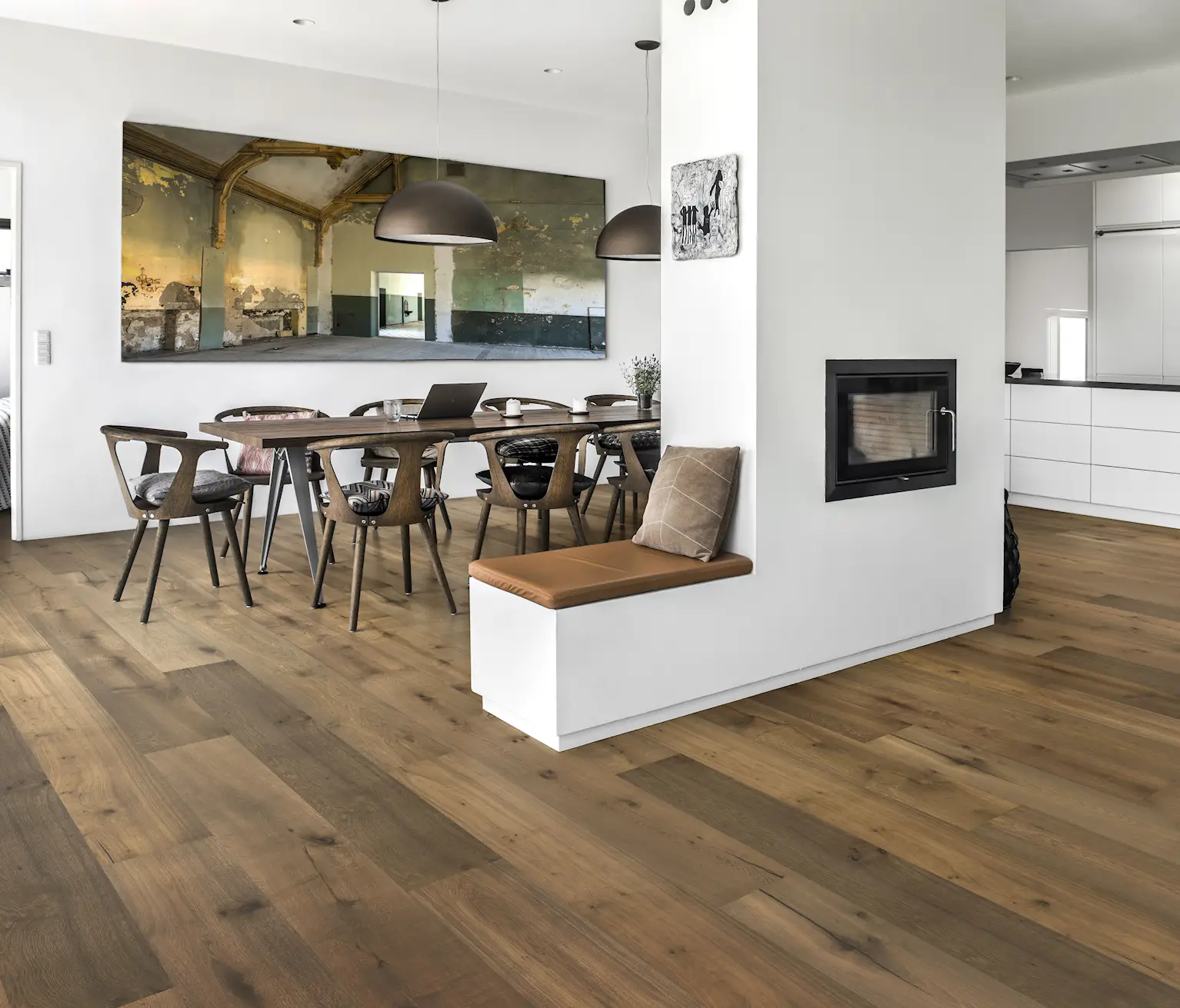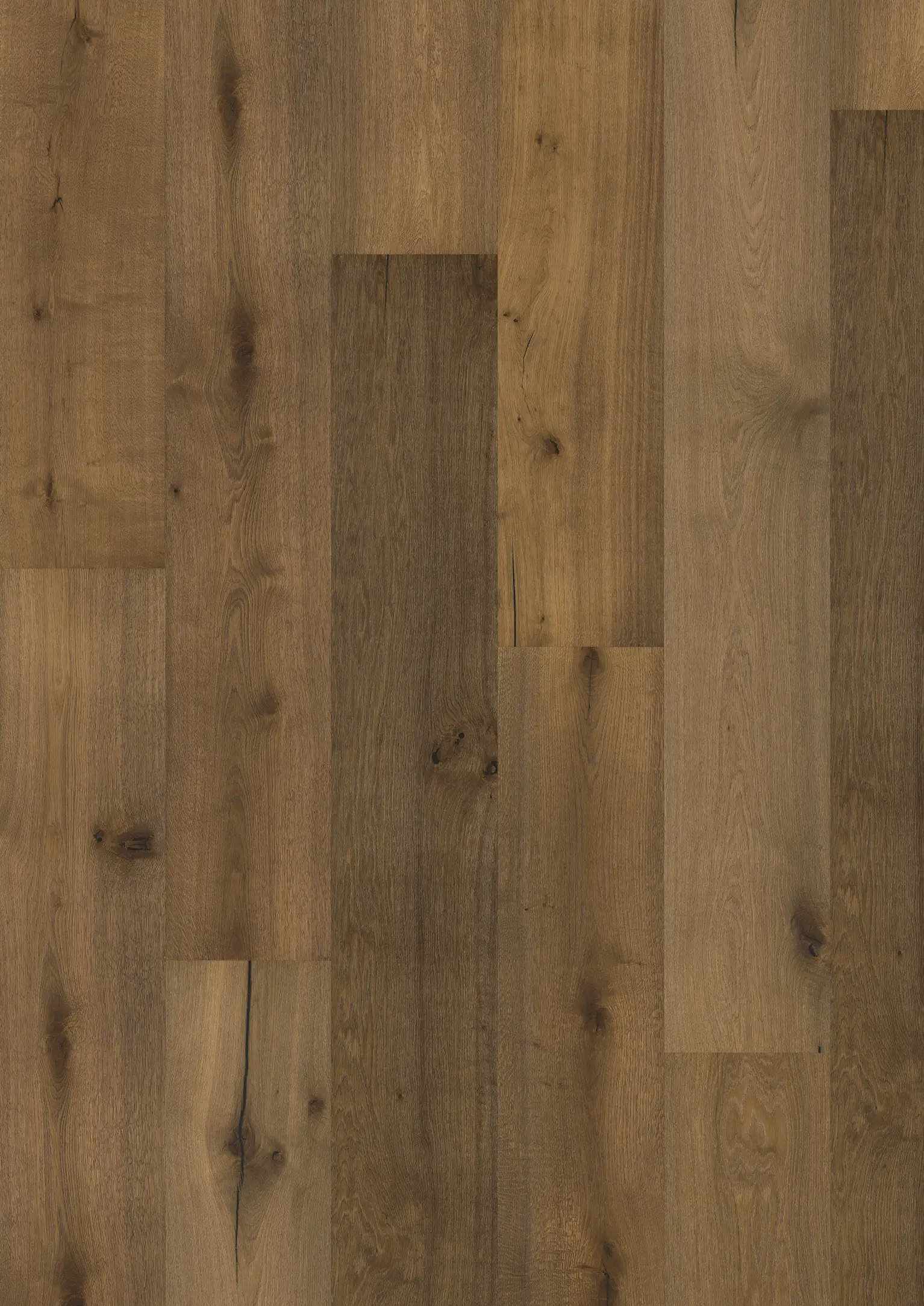 Plank oak floor with smoked stone hues that enhance earthy undertones and balance the wood’s contrasts. Brushed to highlight grain texture, with four-sided bevels for a classic full plank appearance.