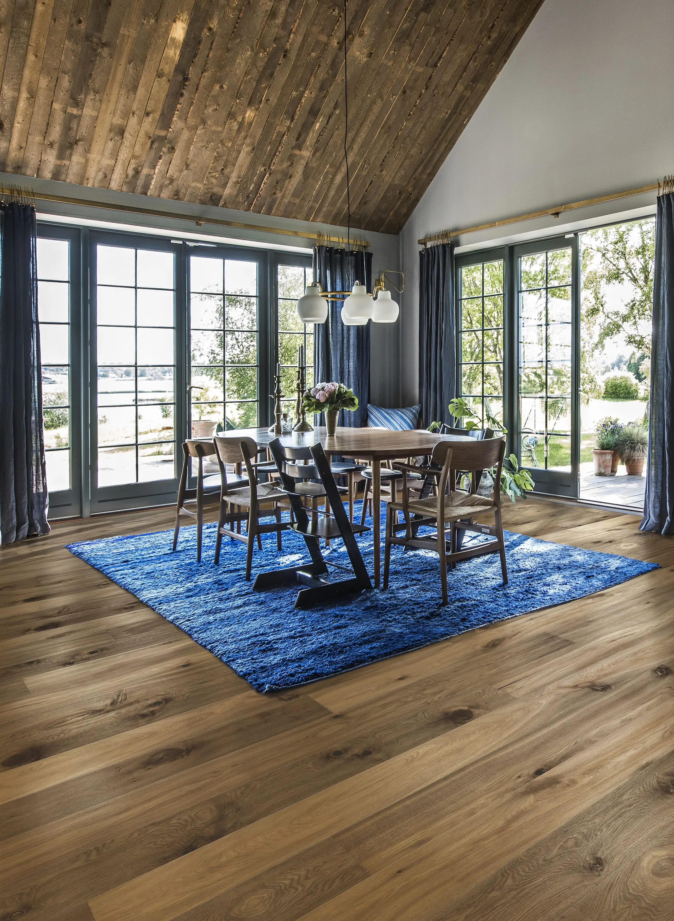 Rich and warm tones from amber provides natural contrast and liveliness. The scraped, 3 dimensional structure enhances the knots, giving the floor a worn look and feel.