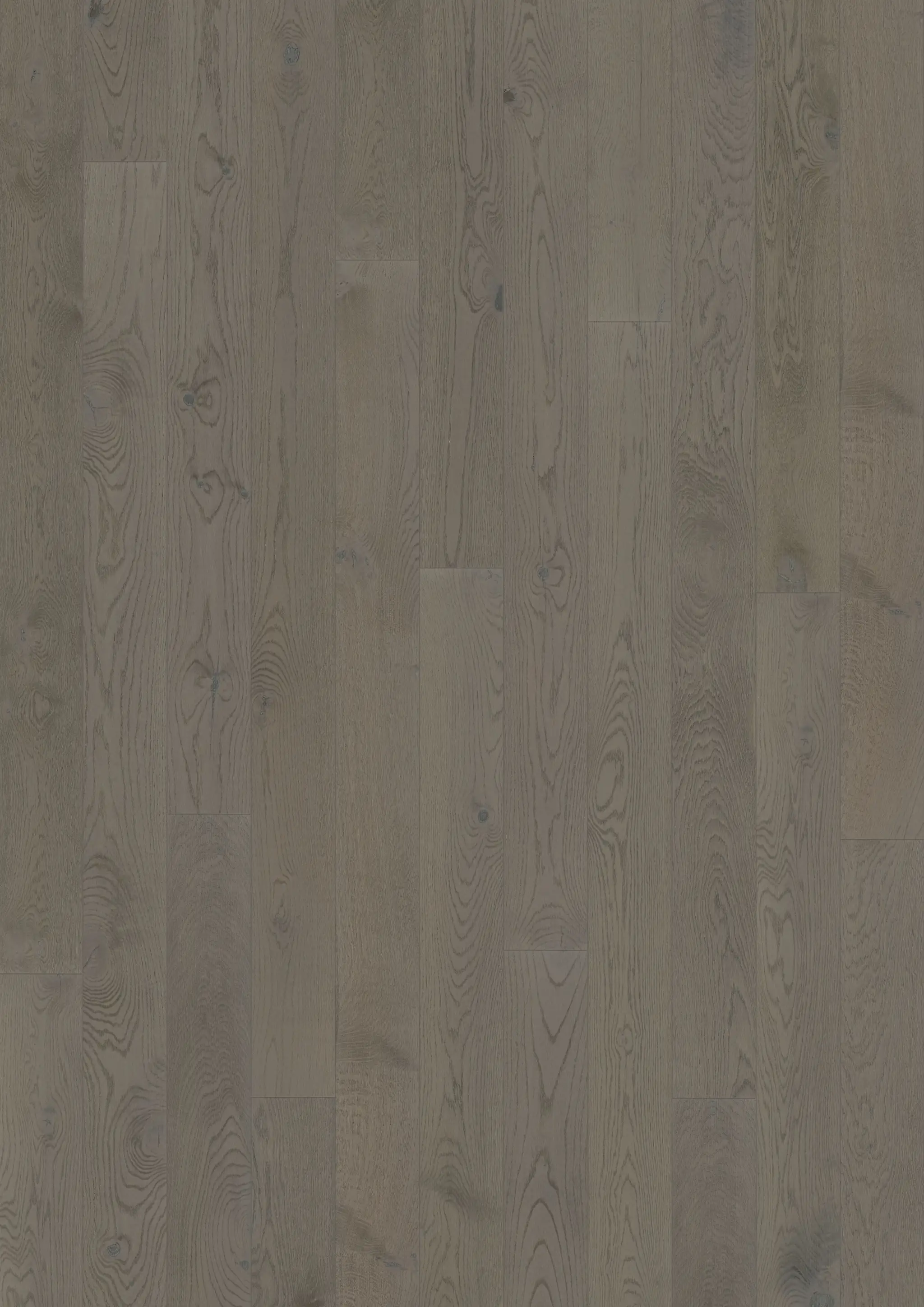 The smoky brown nuances of this single-strip oak floor from the Canvas Collection range from light to dark, and are stippled with a striking variety of knots for a rustic expression. Each board is carefully brushed to bring out the character of the grain and highlight the natural texture of the wood. The matt lacquer finish eliminates glare while protecting the wood from daily wear. Four-sided bevelling at the edges ensures a classic full plank look and feel.