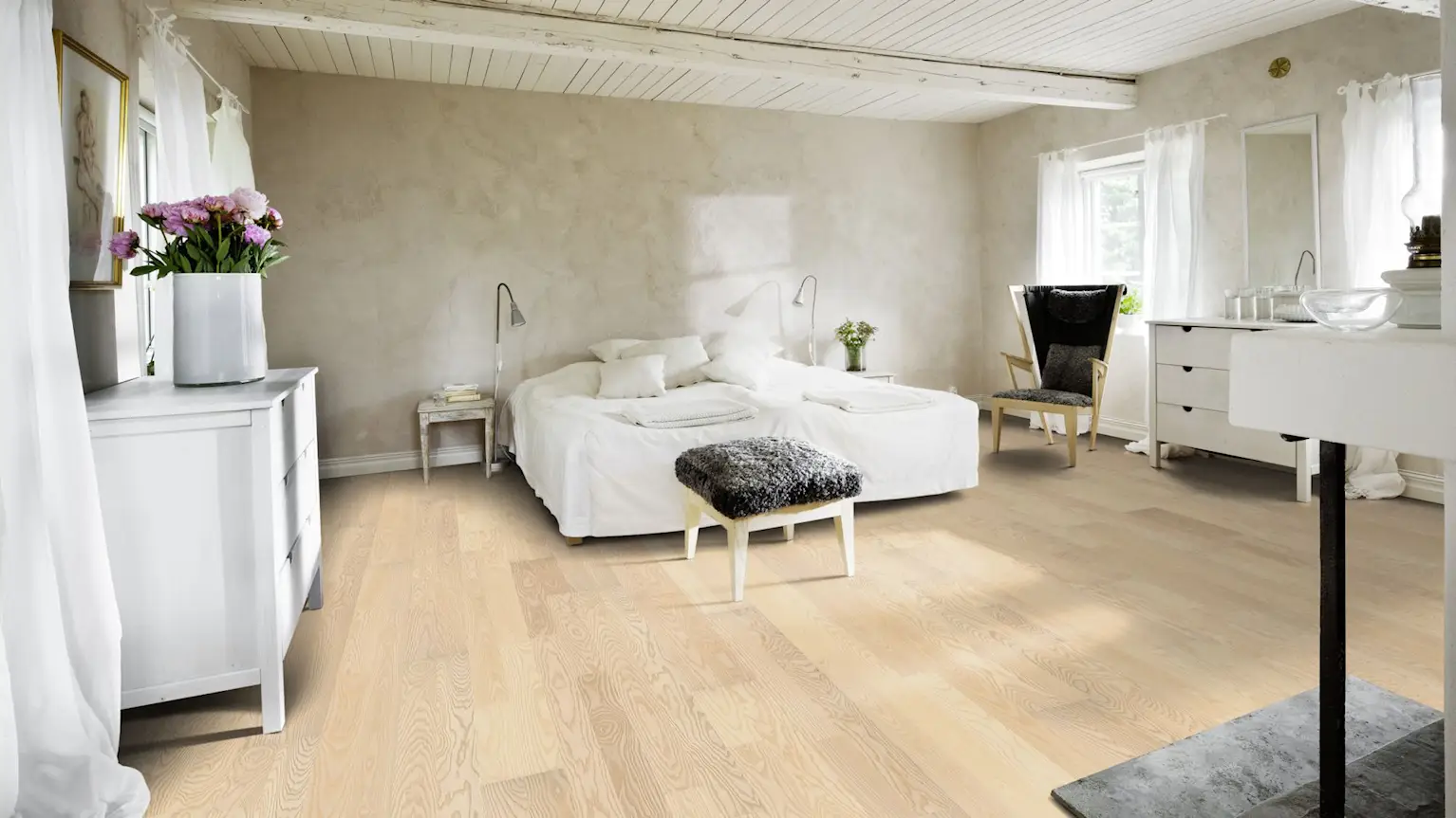 2-strip ash floor with a clean white finish that enhances the natural grain. Matt lacquer adds glare-free protection and durability.
