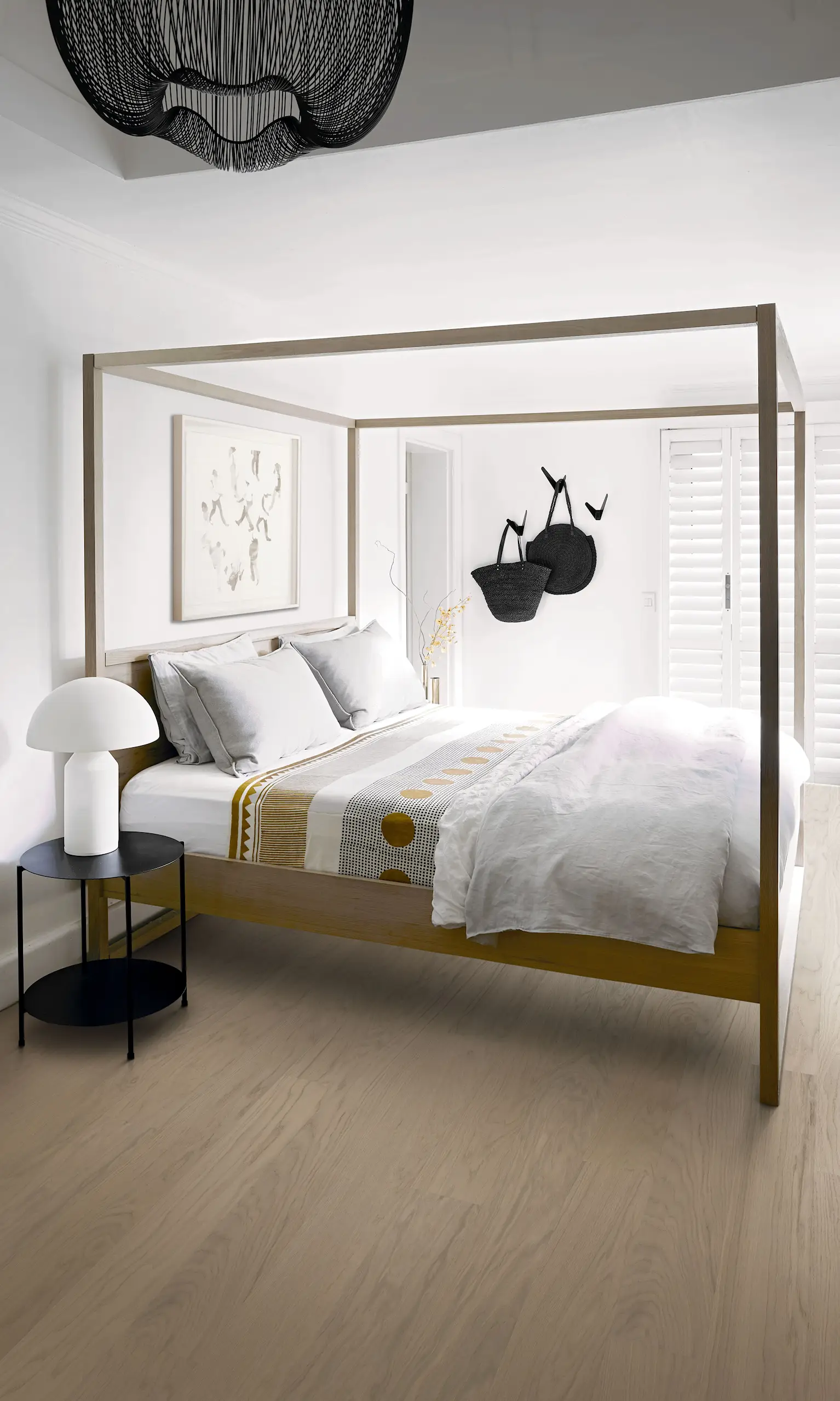 Silvery greige oak evoking driftwood tones. Calm and timeless with microbevels and soft matte finish.