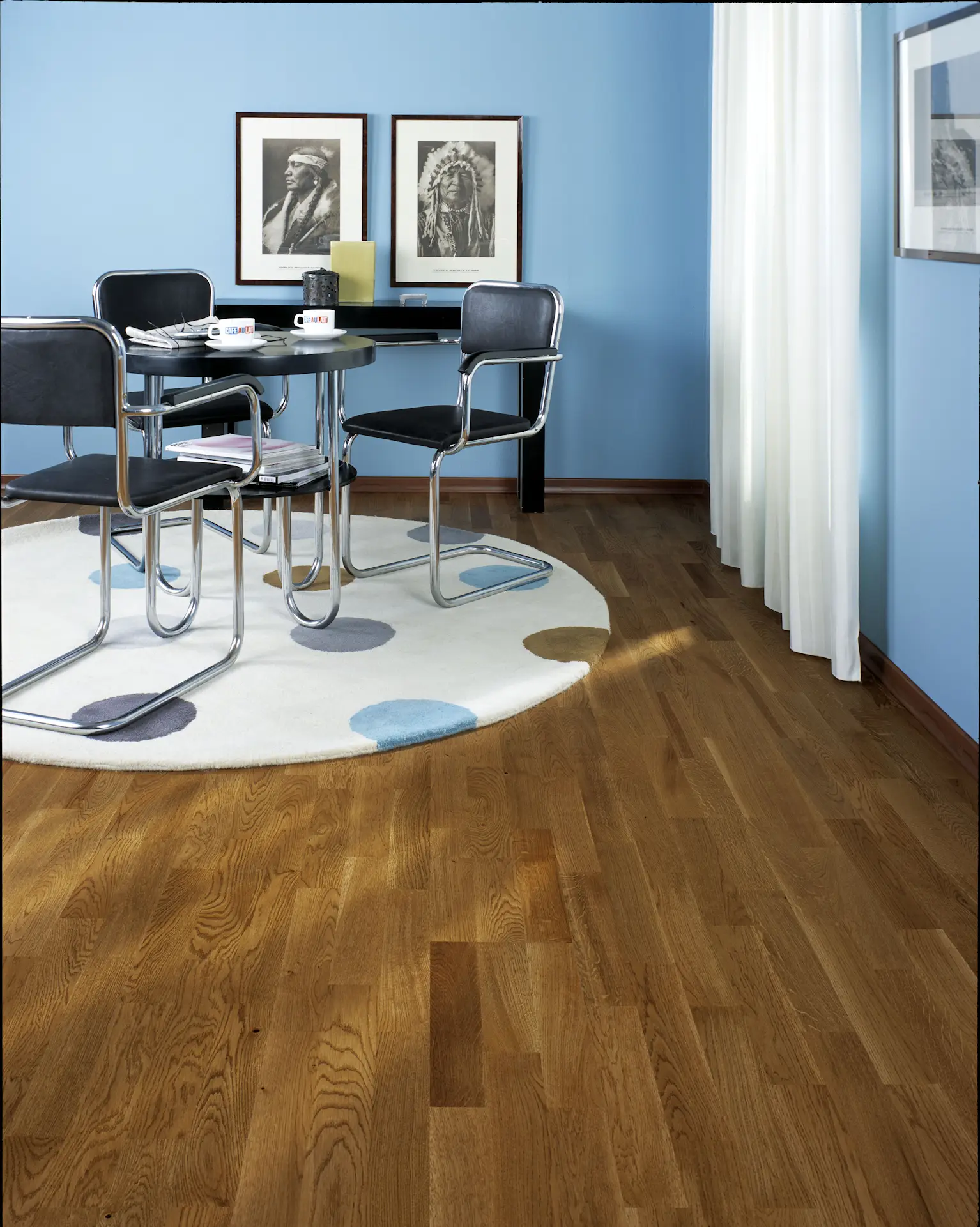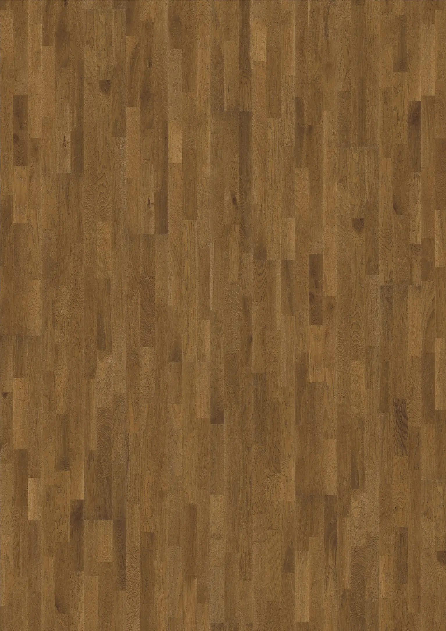 The chestnut-brown stain found in this 3-strip oak floor from the Tres Collection enhances the natural grain for a timeless expression. The silk lacquer finish gives the floor a polished appearance and brings out the character of the timber. The even finish protects the wood from daily wear, without adding artificial shine.