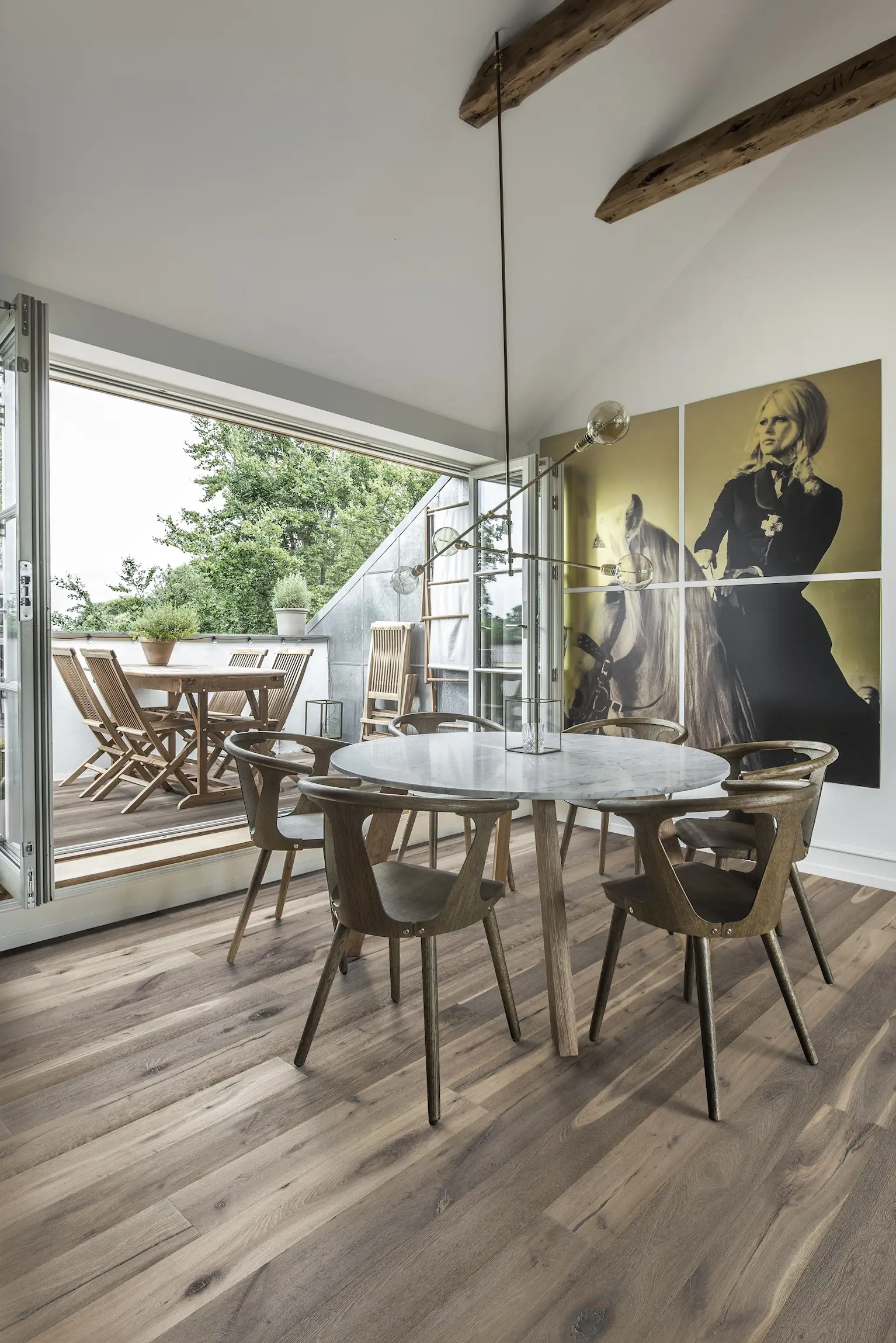 The natural oil stain on this single-strip oak floor from the Founders Collection accentuates the lightly smoked finish, resulting in a subtle, rustic expression. Every board is carefully brushed to bring out the character of the grain and highlight the texture of the wood. Four-sided bevelling at the edges ensures a classic full plank look and feel. Hand-scraping enhances the worn appearance of the floor.