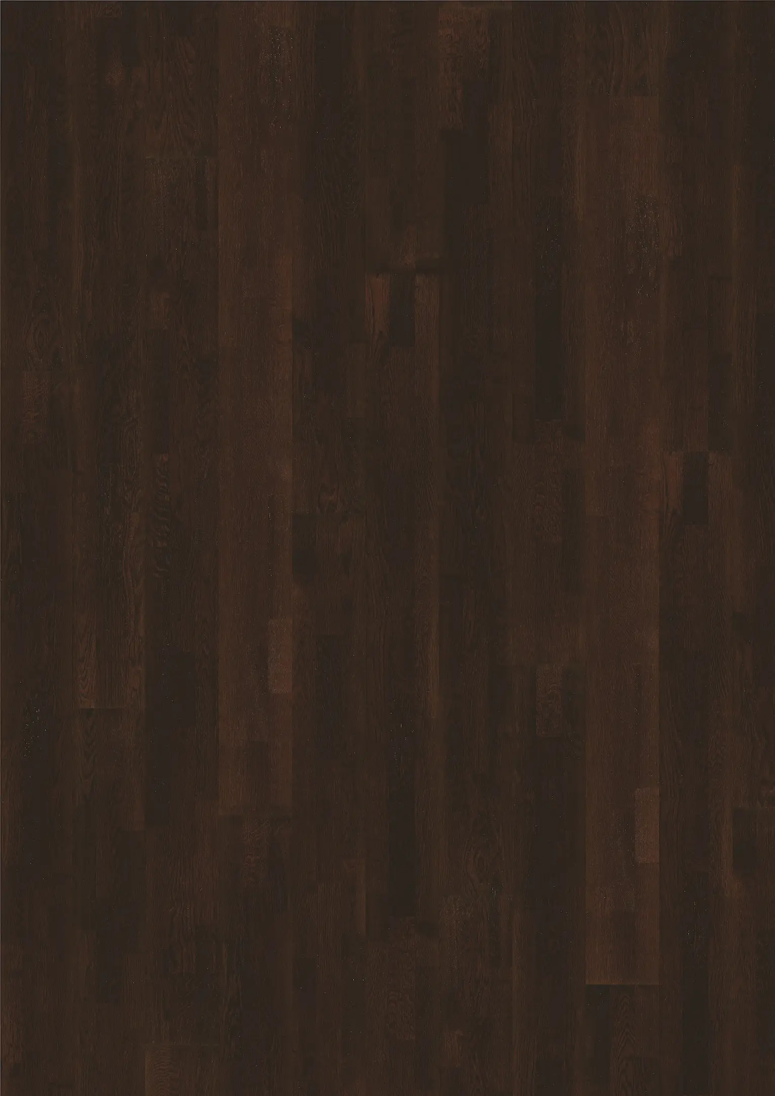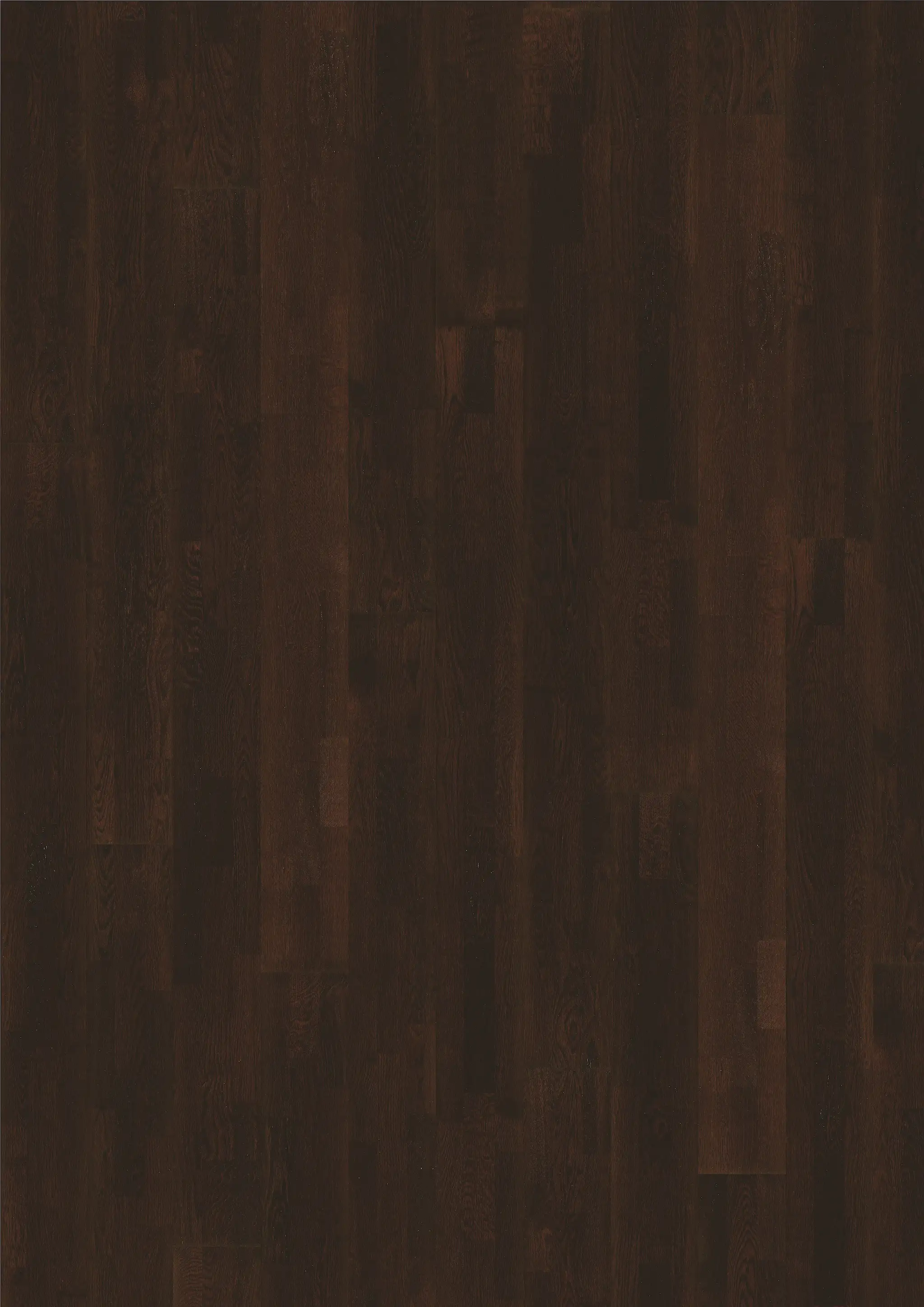 3-strip stained oak floor with a rich dark brown finish for an elegant, refined look. Silk lacquer adds a polished appearance while enhancing the wood’s natural character and providing durable, low-sheen protection.